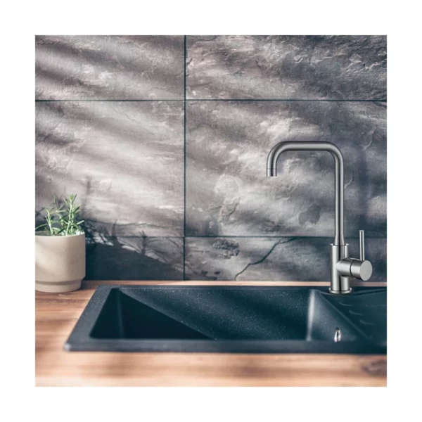 - Bica Móvel 360º: Amplitude total de movimento que facilita a colocação de uma vasilha ou panela na pia e à torna compatível com cubas duplas.