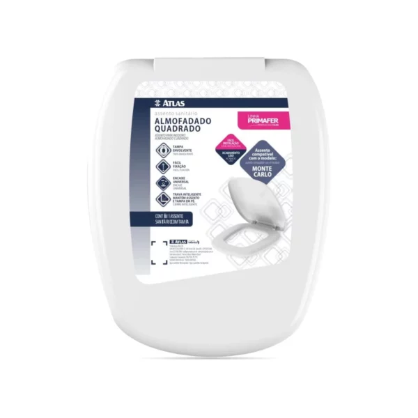 | Modelo | Assento Sanitário Almofadado, Quadrado, Cor Branco, Linha Primafer, Atlas. |