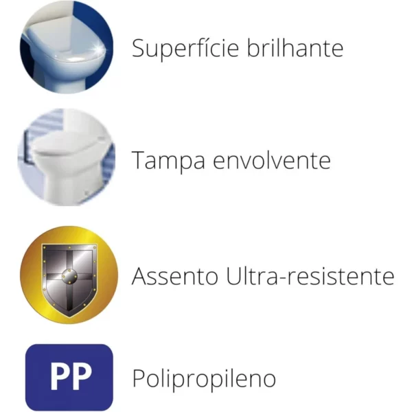 - Assento universal para todas as bacias ovais, em polipropileno, higiênico e de fácil limpeza, confortável, resistente, com tampa envolvente e superfície brilhante
