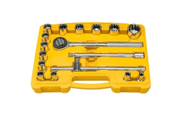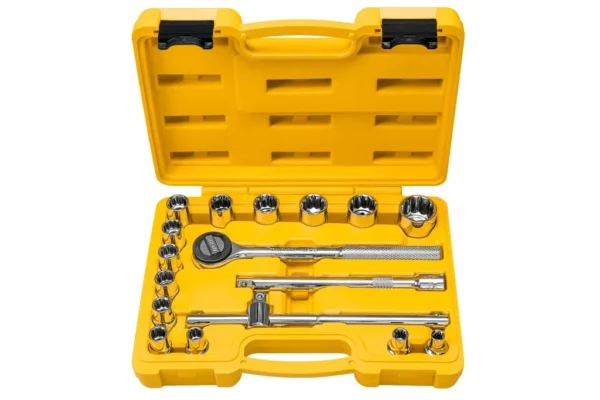 Jogo de Soquetes Estriados Encaixe 1/2 em Aço com Acabamento Cromado e Maleta 17 Peças